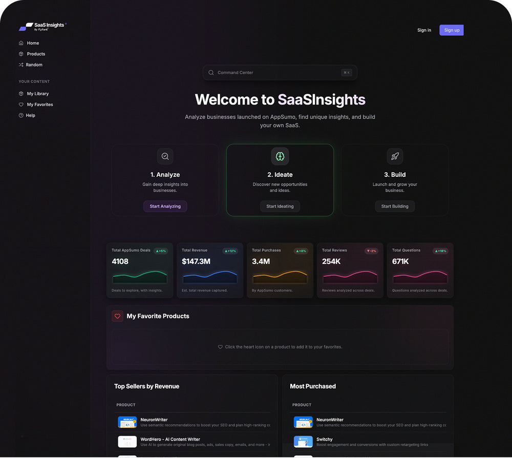 Marketplace intelligence for opportunity discovery. Analyze businesses launched on AppSumo, Shopify, and other SaaS marketplaces to uncover real signals — revenue, demand, reviews, questions, and category trends — and turn them into ideas worth building.